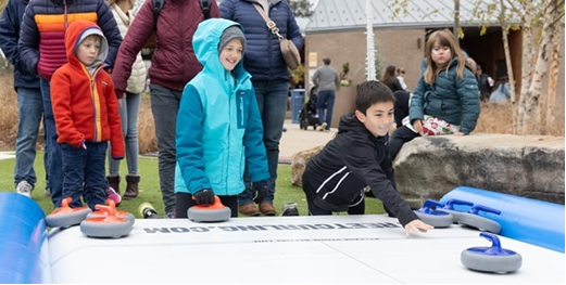 More than 400 people bundled up Saturday for Gold Medal Games at Downtown Cary Park (DCP), cheering on Team USA while stepping into the action themselves. Guests watched live Olympic coverage on big screens and joined interactive games and challenges across the park, testing their skills with inflatable curling and a slap shot booth, trying VR skiing, and competing in the DCP Biathlon. Families also crafted bobsleds to race down a miniature ice track, posed at an ice sculpture photo op, and designed their own Olympic-style medals.