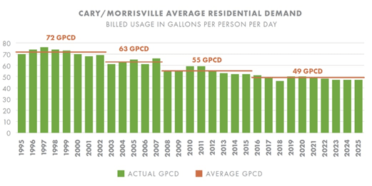 Cary has long prioritized water conservation, with per capita water demand steadily decreasing over the past three decades. The existing year-round conservation approach remains in place, including alternate-day watering, and no additional restrictions are anticipated at this time.