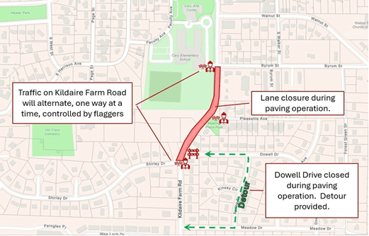 Beginning Monday, the outside lanes of Kildaire Farm Road will be resurfaced between Byrum Street and Shirley Drive. A lane closure will be in place with two-way traffic maintained by a flagging operation. This work will take approximately two days, weather dependent. Dowell Drive will be closed at Kildaire Farm Road, with a detour in place via Meadow Drive. Shirley Drive should not be used as an alternate route during this time, as sewer main replacement work is ongoing.