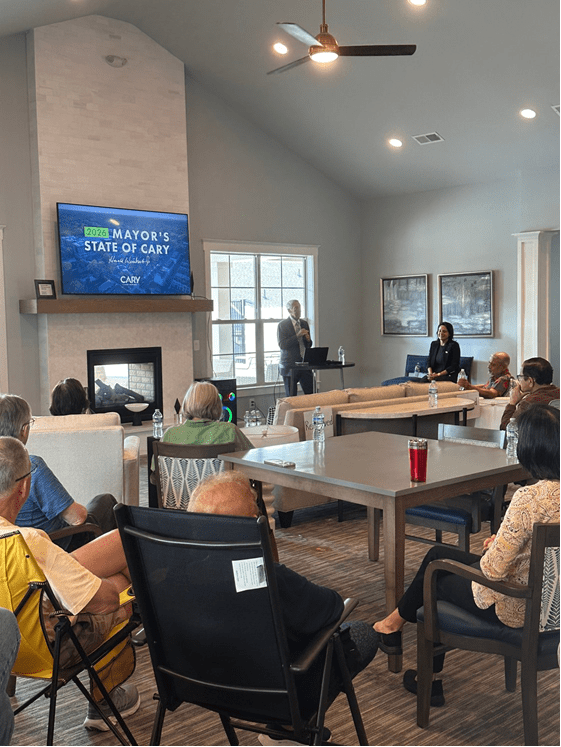 Mayor Harold Weinbrecht gave remarks at the State of Cary presentation at the Courtyards at West Cary Clubhouse; also in attendance was Councilwoman Sarika Bansal. This event provided residents with updates on Town progress, priorities, and upcoming initiatives.
