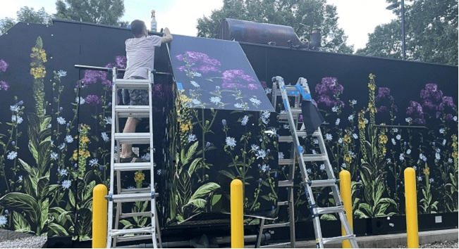 Mural installer, RAD Graphics, has been working to complete the digitally produced mural that was created by artist Rhett Hissam. The artwork creates an illusion of a field of native flowers on the north side of the generator that faces the Herbert C. Young Community Center parking lot.