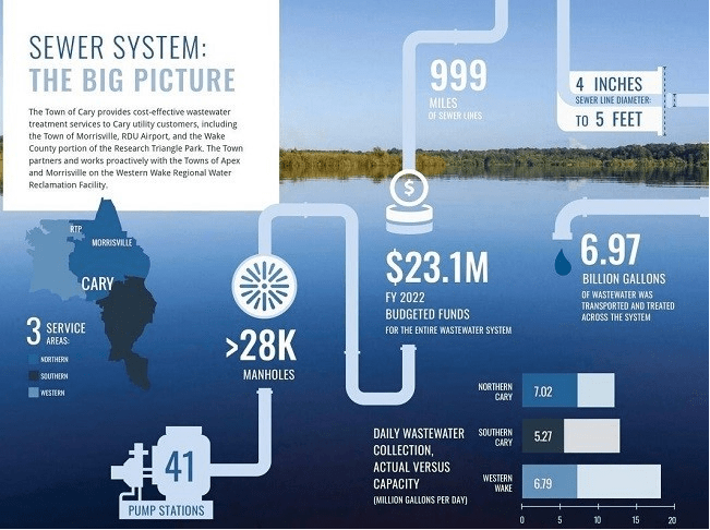 Cary’s 2021/2022 Annual Wastewater Report is now available and provides quick facts, descriptions of our treatment facilities, system metrics, and tips to keep the system working smoothly and the environment free from sewer spills. In addition, new to the report this year is a graphic about sewer laterals, which details how homes are connected to the wastewater system. We are happy to once again show that our water reclamation facilities had another year of exceptional performance, and our wastewater system is among the top performing utilities in the state.