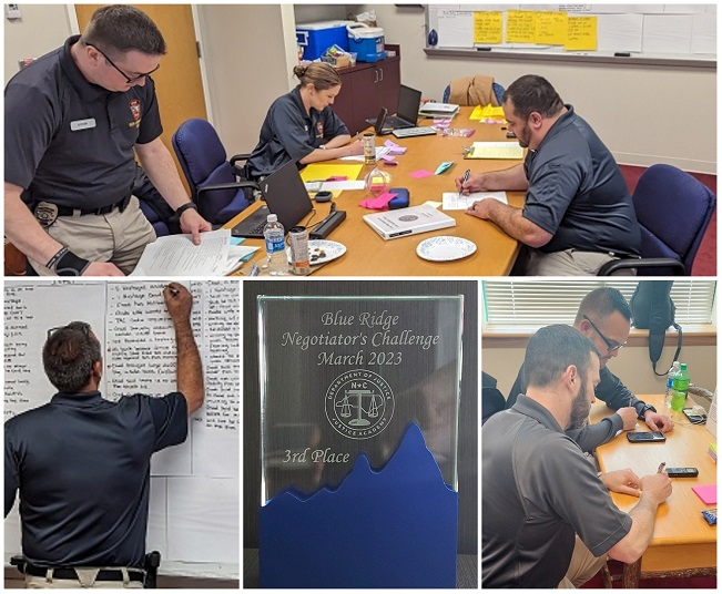 Cary’s Crisis Negotiation Team (CNT) competed in the 2023 Blue Ridge Negotiator’s Challenge hosted by the North Carolina Justice Academy. They competed against crisis negotiation teams from 14 agencies from across the country. The CNT earned 1st place for a municipality, and 3rd place recognition overall – behind two federal agencies. Teams were judged on several topics including active listening, team communication, structured brainstorming, intelligence and information management and documentation, risk assessments, and the managing of demands and deadlines.