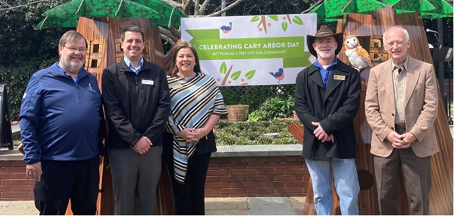 Cary celebrated its commitment to urban forests at Arbor Day. Approximately 800 guests took part in commemorating Cary’s 40th consecutive designation as a Tree City USA community from the Arbor Day Foundation. Mayor Pro Tem Don Frantz and Council Members Ryan Eades and Carissa Kohn-Johnson honored Hometown Spirit Award winners with Arbor Day trees via a brief ceremony that was paired with tree sapling giveaways from the Ask and Arborist booth. The event was rich with environmental engagement thanks to community partner groups who helped host 24 education stations covering topics such as proper tree planting techniques, composting, native plants, and climate action. Live bird demos with a professional falconer, the chance to contribute to a tree-themed public art mural, and locally sourced food were big hits as community members enjoyed the free festivities.