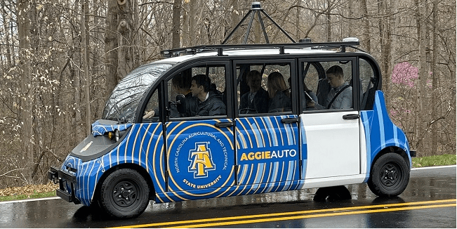 With CASSI off and running in Bond Park, staff had an opportunity to experience more autonomous driving with the students and faculty at North Carolina A&T State University in Greensboro. As a member of North Carolina’s Future of Autonomous Vehicles (FAV) Committee, Traffic Engineer David Spencer joined other committee members to hear from Dr. Ali Karimoddini and his students about the impressive work and achievements of the Autonomous Cooperative Control of Emergent Systems of Systems (ACCESS) Laboratory. NC A&T’s ACCESS Lab has developed a rural testing track in Brown Summit, where they test a developing fleet of autonomous shuttles and vehicles for operations in a rural environment. The ACCESS Lab will move on to test their vehicles in an urban environment by providing a connection from the NC A&T campus to downtown Greensboro, featuring a one-mile loop that connects restaurants and shops. This experience was valuable as staff further understood the capabilities of various AV technology and how it could be applied in a wide range of applications.