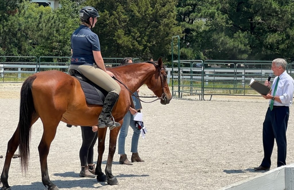 The inaugural recipient of this award was River, a thoroughbred racehorse, who after her career ended moved around from farm to farm until she ended up at CORRAL in Cary. CORRAL matches up at risk girls with horses. This results in both the girls and the horses being helped. I witnessed firsthand the love and affection of the girl, DJ, and her horse River. It was a very special thing to see. I presented the medallion to the owner of CORRAL, a ribbon to River, and a $2500 grant to CORRAL and River.