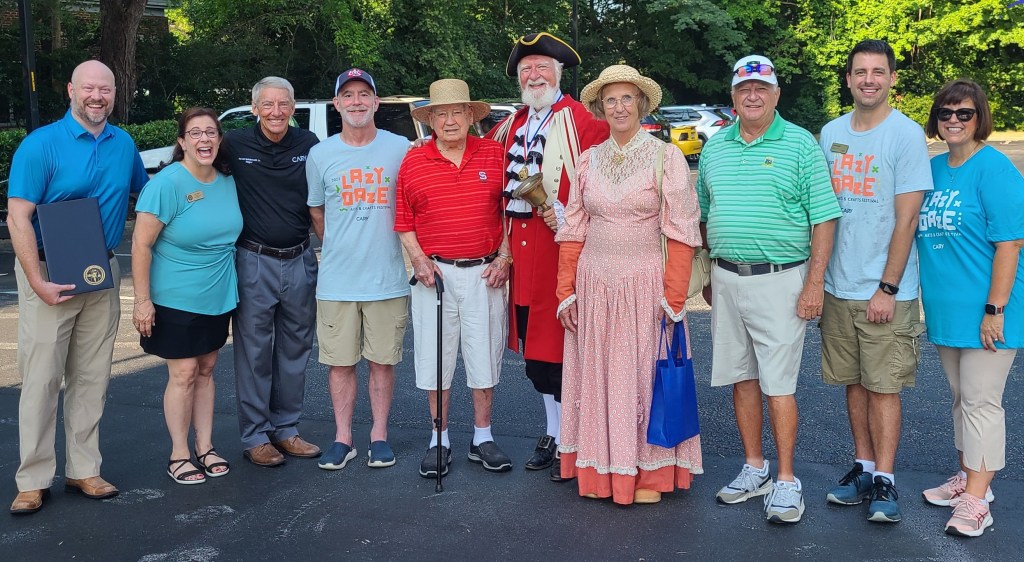 This was followed by a reading of a proclamation from the town crier John Webster. The Cary High School band then played the Star-Spangled Banner, and I followed them with remarks. I noted that there were 250 artists, crafts, and performers from 15 states here. I had a great time talking with people and having my picture made with our special guests.