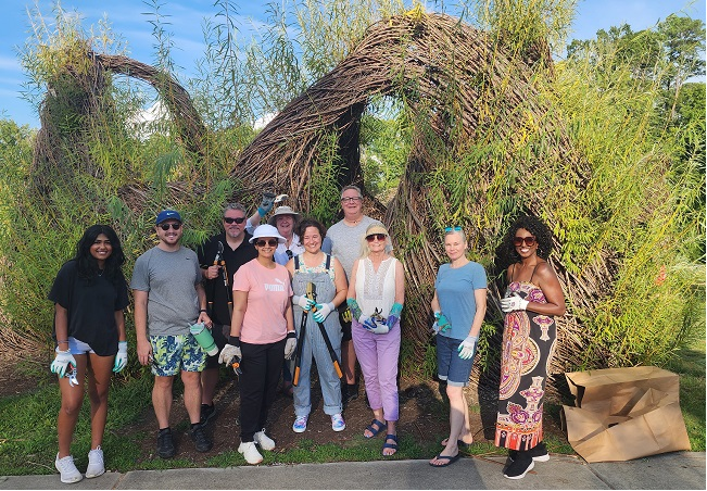 Members of the Public Art Advisory Board gathered for a work meeting at Carpenter Park for their August session to trim and tuck in willow branches on the Patrick Dougherty willow sculpture, “Fly Away Home.” This living sculpture is greatly cherished by residents in the western neighborhoods of Cary. The Board, along with a few additional volunteers, dedicated their time to its maintenance, ensuring doorways and windows remain accessible.