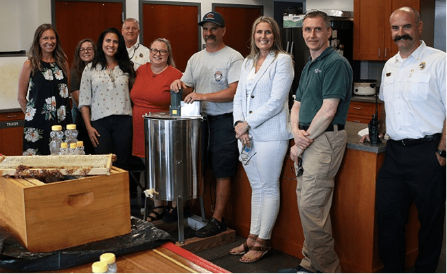 Successful beekeeping at South Cary Water Reclamation Facility (SCWRF) in 2022 lead to a nine-month trial period beginning March 2023 for staff and volunteers to expand pollinator protection efforts across town and to nurture honeybees at other locations like five of Cary’s fire stations and the Cary Senior Center Garden. While honey in the first year is generally saved for the bees to self-feed during winter, Cary’s hives are doing well with the assistance of dozens of recently installed native pollinator gardens across town. As staff and volunteers enter the next phase of learning about beekeeping, a couple of frames from each hive were able to be harvested this summer for people to share. At the end of July, staff across departments and Senior Center volunteers gathered at Fire Station 2 to be educated on the honey harvesting process by firefighter “Bee Lead” Davis Hodges. The success midway through the pilot has exceeded expectations and staff are moving towards long-term sustainable approaches for these precious golden drops. As honey cannot be harvested again until summer 2024, this time will be used to evaluate existing and develop new policy and procedures associated with pollinator ecosystems, bees, and honey.