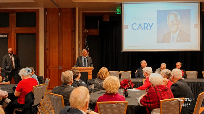 Wednesday night Council member Jack Smith and I attended an appreciation dinner for the CAP (Citizens Assisting Police) held by the Cary Police Department. Comments were made by Sgt. Dustin Wright, Chief Terry Sult, and me. In my remarks I recognized the contributions of Al Slonim with a Proclamation noting his years of service to the CAP team and being a leader of the Cary Police Department’s Winter Wonderland.