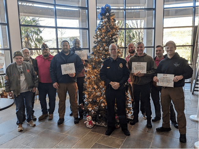 This past week, members of Veterans of Foreign Wars (VFW) Post 7383 “conferred service citations” to the officers and leadership team of Project PHOENIX in appreciation of their continued support to our annual Winter Wonderland Holiday event. Winter Wonderland is Project PHOENIX’s capstone event where they partner with non-profit and faith-based organizations, including VFW Post 7383, to provide Christmas presents for deserving children in our community. In his remarks to the team, Gunnery Sergeant Jeff Sherman commended the group for their exemplary character and steadfast devotion to duty and service to the community, ensuring that those less fortunate families are not overlooked this holiday season. Gunnery Sergeant Sherman gave certificates to Captain Rob Carey, Sergeant Dustin Wright, and Officers Pat Fox, Matt Beale, and Jeff Morgan.
