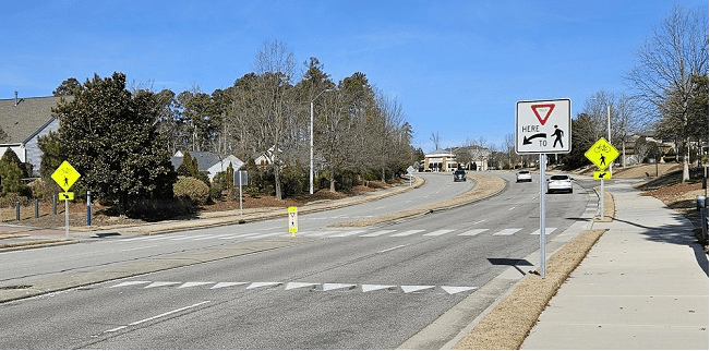 New pavement markings and traffic signs were recently installed in western Cary, along Yates Store Road, to enhance the visibility of two greenway crossings. Designed and funded through Transportation’s Spot Traffic Safety Program and executed in partnership with Public Works, these improvements promote safety for users of the Morris Branch and Amberly Lake greenways by encouraging awareness of pedestrians.