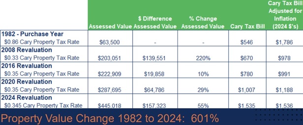 There was also interesting information on individual property values. The staff presented six random properties in Cary showing the value of the property and taxes over time based on today’s dollars. All properties showed a significant increase in value but four out of the six showed a decrease in taxes (today’s dollars).