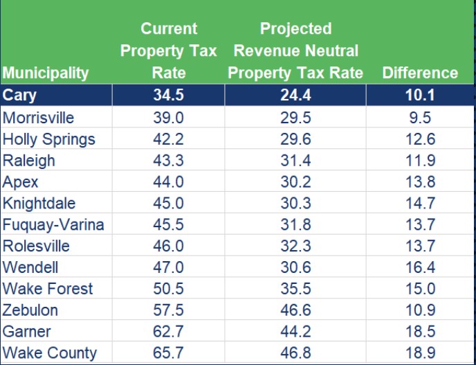Cary’s current tax rate is 34.5 cents per $100 of value which is the lowest in Wake County by 4.5 cents. Our revenue neutral rate would be 24.5 cents per $100 of value. Other points noted from the financial report included: