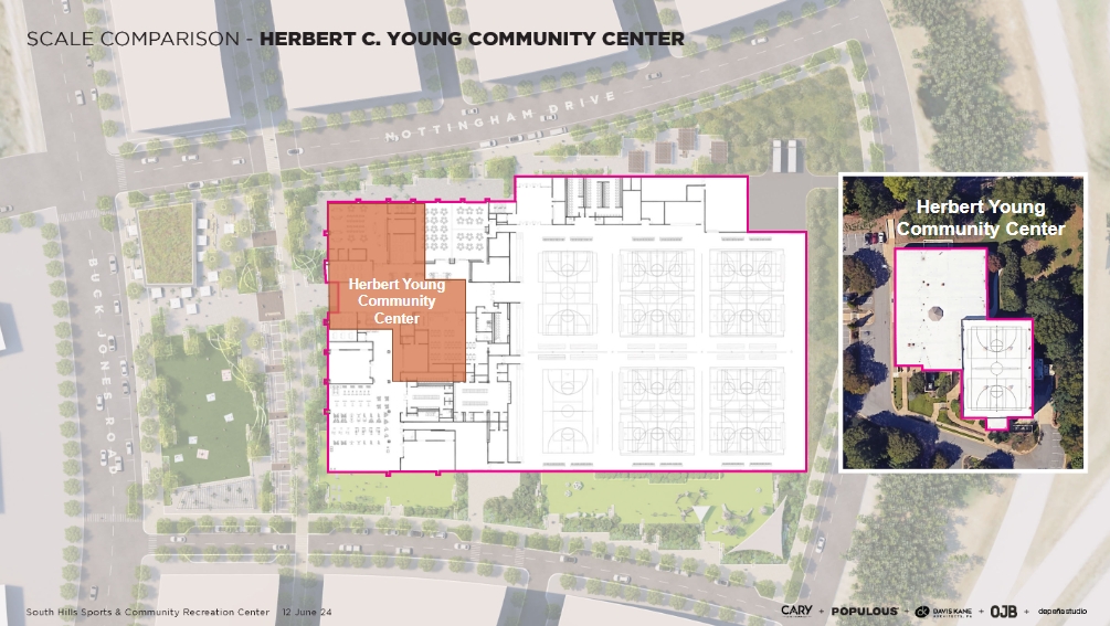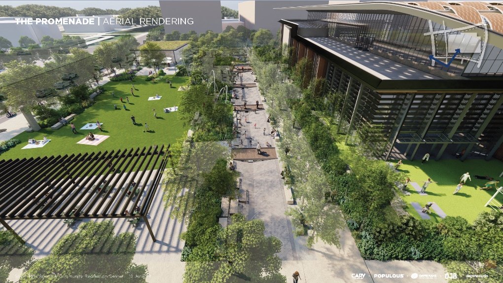 The Centre is planned to have a Community Center, a Senior Center, and competitive space. Wake County has committed $75 million for the competitive space. The competitive space was originally planned for 10 sports courts that could be for basketball, volleyball, pickleball, etc. The concept now has it scaled down to eight courts.