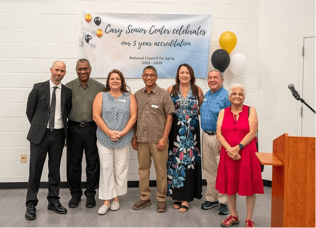 On Wednesday, Councilmember Carissa Kohn-Johnson, Program Manager for Seniors and Aging Michelle Barrett, members of the Senior Advisory Board, and older adults attended an event at the Cary Senior Center to celebrate its national accreditation from the National Council on Aging (NCOA). This accreditation, awarded this year, followed a thorough examination of the center’s operations, programming, and services.