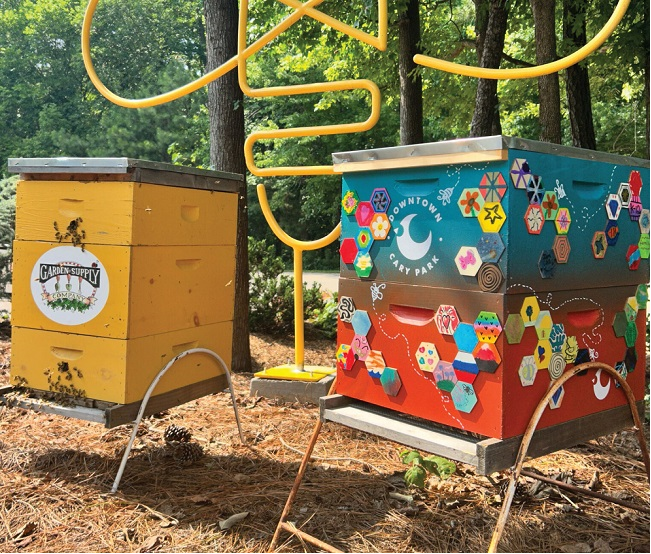 Cary is participating in Garden Supply Company’s host-a-hive program and partnering with them on programming at the Downtown Cary Park. The beehives, which were decorated by our community during a June pollinator week event at the park, have been installed at Garden Supply Company on Old Apex Road. The beehives will soon be filled with a colony of bees, and later this year, Garden Supply will harvest the honey and provide it to Park staff for use in future programs.