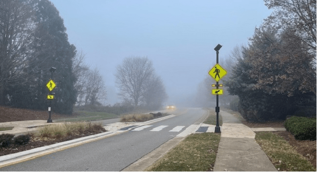 On December 6, the recently installed crosswalk on Arthur Pierce Road was equipped with a Rapid Flashing Beacon. This device alerts motorists of pedestrians in the area at the push of a button. As staff were out inspecting this device on a foggy morning, they were pleased to see motorists yielding for the crosswalk when the device was activated.