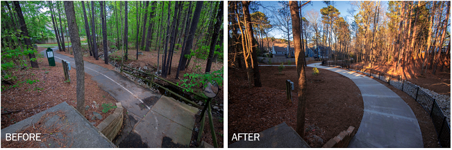 An important safety improvement and stormwater maintenance project along the White Oak Creek Greenway is now complete. The trail was widened, and the curves near the entrance to the tunnel under Cary Parkway were softened, significantly enhancing sightlines on the east side of the tunnel. Additionally, a stormwater culvert was repaired, and new safety railings were installed.