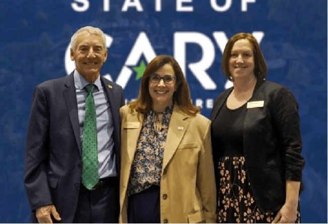 On Tuesday, Mayor Weinbrecht delivered the State of Cary Address at Glenaire, joined by At-Large Councilmember Lori Bush and District B Representative Michelle Craig, who also spoke during the event.