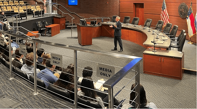 Thursday night the council held its first regularly scheduled meeting of the month. Other than the consent agenda there was only one item on the agenda. A public hearing on a Yates Store Road rezoning proposes 67 detached units and 25 townhouses. Most of the speakers expressed concerns that a private road, that they had to maintain, would be connected to the new development. After the regular agenda the council spent about an hour in closed session for multiple items.