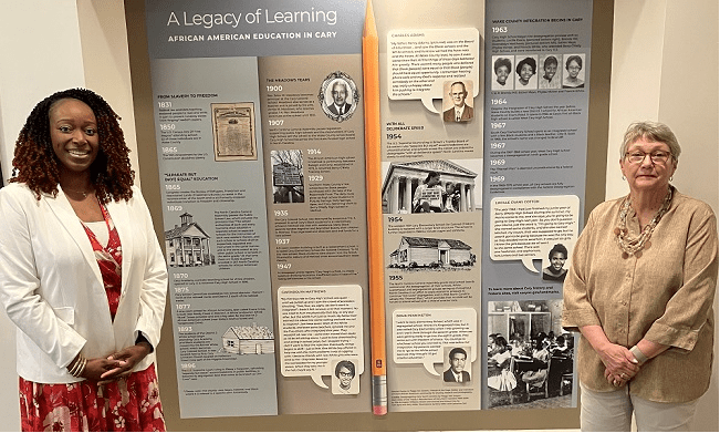 Installed this week at the Cary Arts Center is a new permanent display, A Legacy of Learning: African American Education in Cary, which explores the impacts of segregation and desegregation in Cary education. The project was a collaborative effort involving the Page-Walker Arts & History Center, Human Resources staff, and research support from the Friends of Page-Walker. Peggy Van Scoyoc’s book Desegregating Cary and related oral histories, along with Ella Williams-Vinson’s books Both Sides of the Track I & II, provided rich resources for the display.