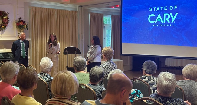 Mayor Harold Weinbrecht, Mayor Pro Tem Jennifer Bryson Robinson, and Councilmember Lori Bush visited the Heritage Pines community to provide an overview of Cary and current projects. Following the presentation, they engaged in a Q&A session with residents. Topics discussed included the post office, street projects, communications, and property taxes.