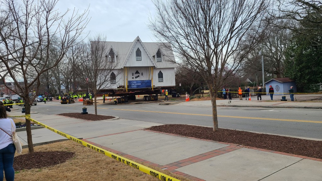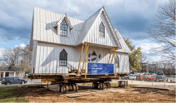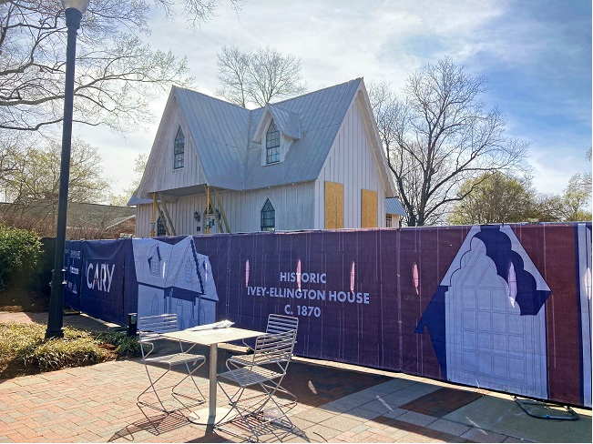 The relocation of the historic Ivey-Ellington House was a success! If you walk downtown this weekend, you will notice a new colorful fence wrap around the house. Featuring new Cary colors and architectural details of the house, this wrap will be recycled into tote bags once the project is complete. The site will remain active throughout the rehabilitation process, which is expected to begin in the coming months.