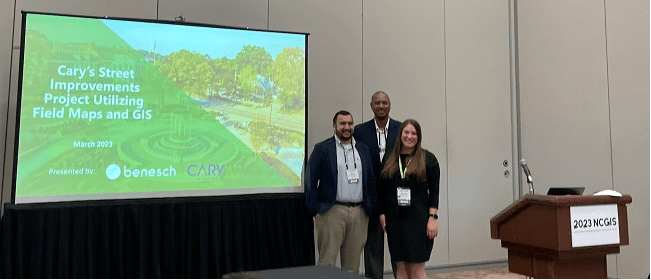 Since 1987, the NC Geographical Information Systems (GIS) Conference has brought together professionals and academia to share in their experiences and learn about current trends and technologies affecting the GIS community. The conference is consistently one of the largest state GIS conferences in the nation. This year Transportation Engineer Amir Nezarati and Civil Designer Coray Davis were selected to present with Benesch on Cary’s Street Improvements Project. The 2023 conference was held in Winston-Salem, and the presentation focused on efforts to utilize GIS field collection programs for increased efficiency with GIS Technology to assist in analysis and decision making within our street improvement process. These systems are critical in maintaining quality roads for Cary citizens.