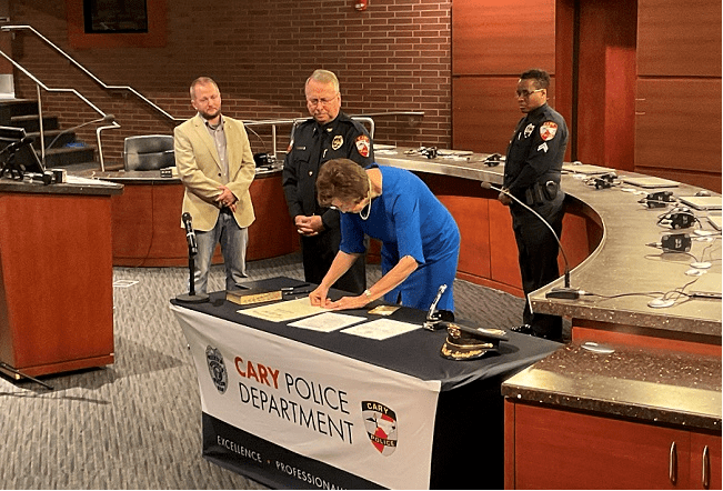 Monday I joined council member Jack Smith in a ceremony to award fifteen Cary Firefighters who received SAVE Awards for their bravery for their actions to rescue several people at the Harlon Drive apartment in March. North Carolina Insurance Commissioner and State Fire Marshall Mike Causey presented the awards to the firefighters who went beyond the call of duty. The Cary Fire Department also received the Commissioner’s Award on Monday for 100 years of service.